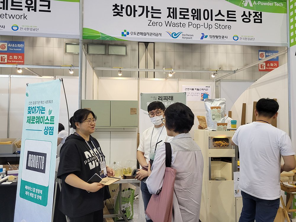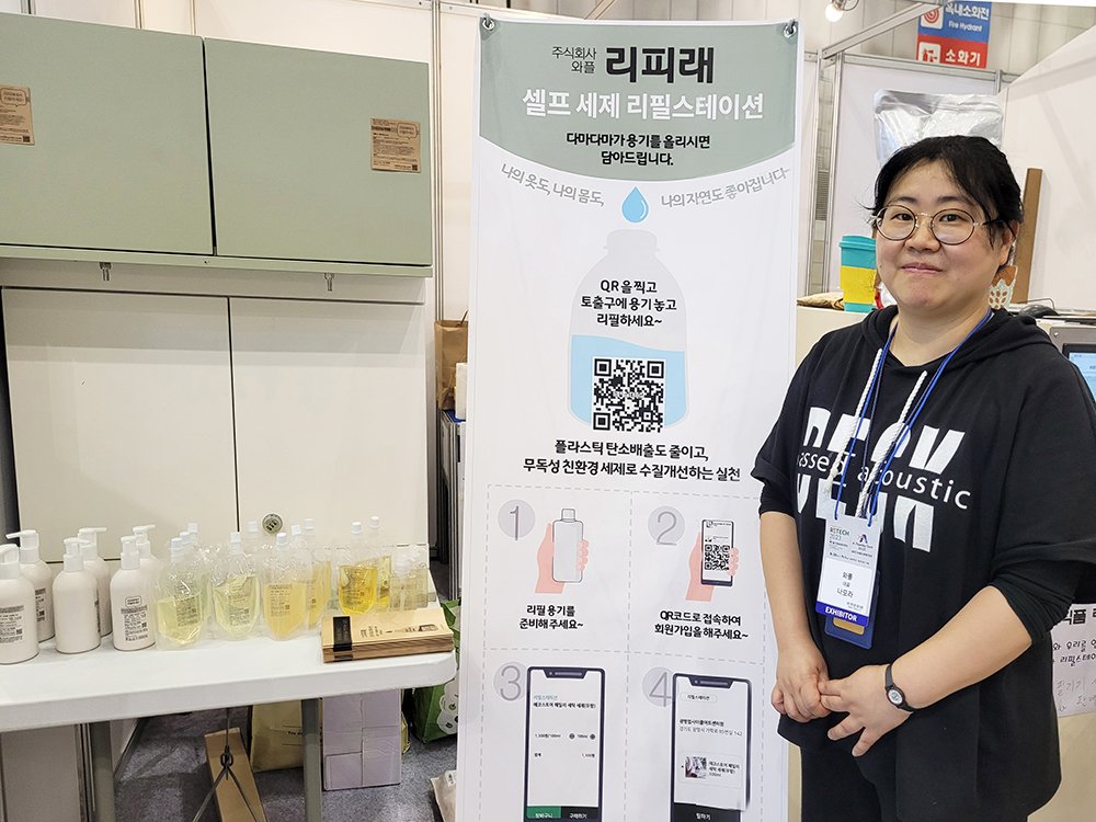 제16회 폐기물᛫자원순환산업전 (RETECH 2023)의 '찾아가는 제로웨이스트상점 부스'. 그중 사물인터넷(Internet of Things: IoT)과 QR코드 기술을 접목한 ‘리피래'에 관람객의 관심이 이어졌다.
