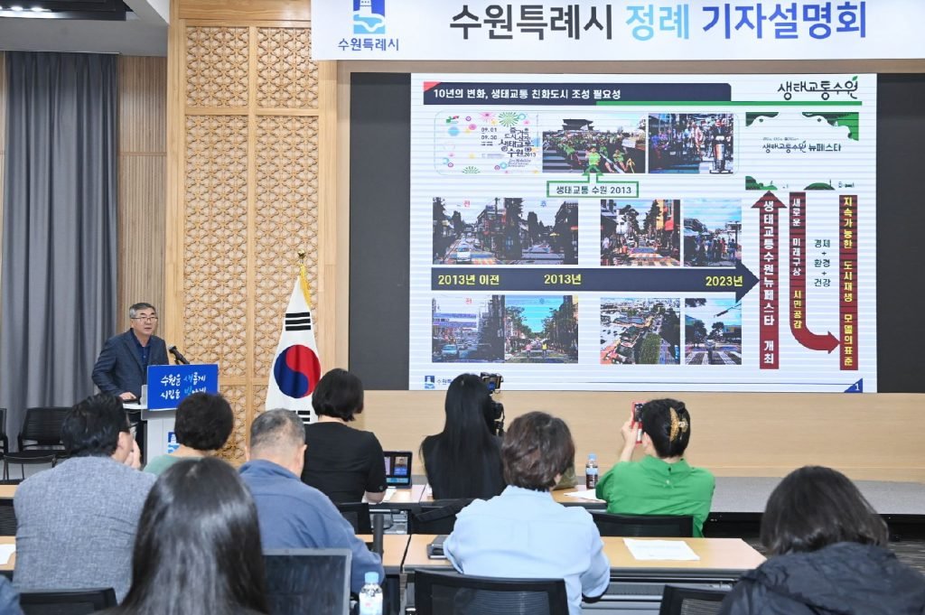 이장환 수원시 안전교통국장은 20일 시청 중회의실에서 열린 ‘민선 8기 정례 언론브리핑’에서 ‘생태교통수원 뉴페스타’와 수원시의 생태교통 정책을 소개했다.