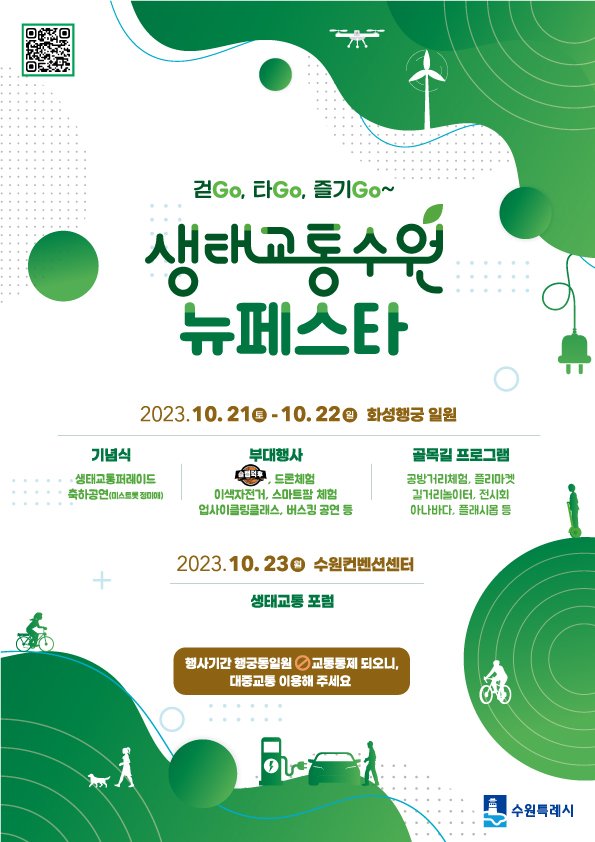 10월 23일에는 수원컨벤션센터에서 ‘시민공감 시민주도 생태교통 활성화 방안’을 모색하는 ‘생태교통 수원 포럼’을 개최한다.