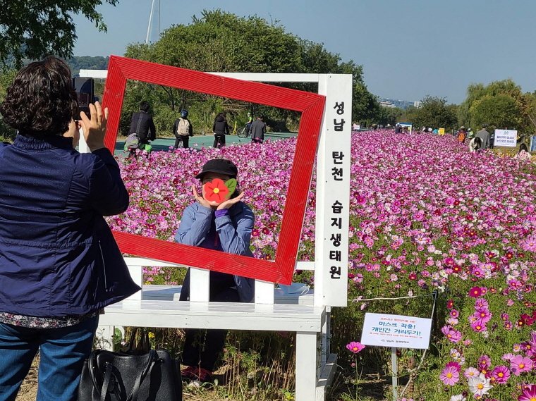 코스모스 길이 있는 성남 탄천 태평습지생태원 포토존
