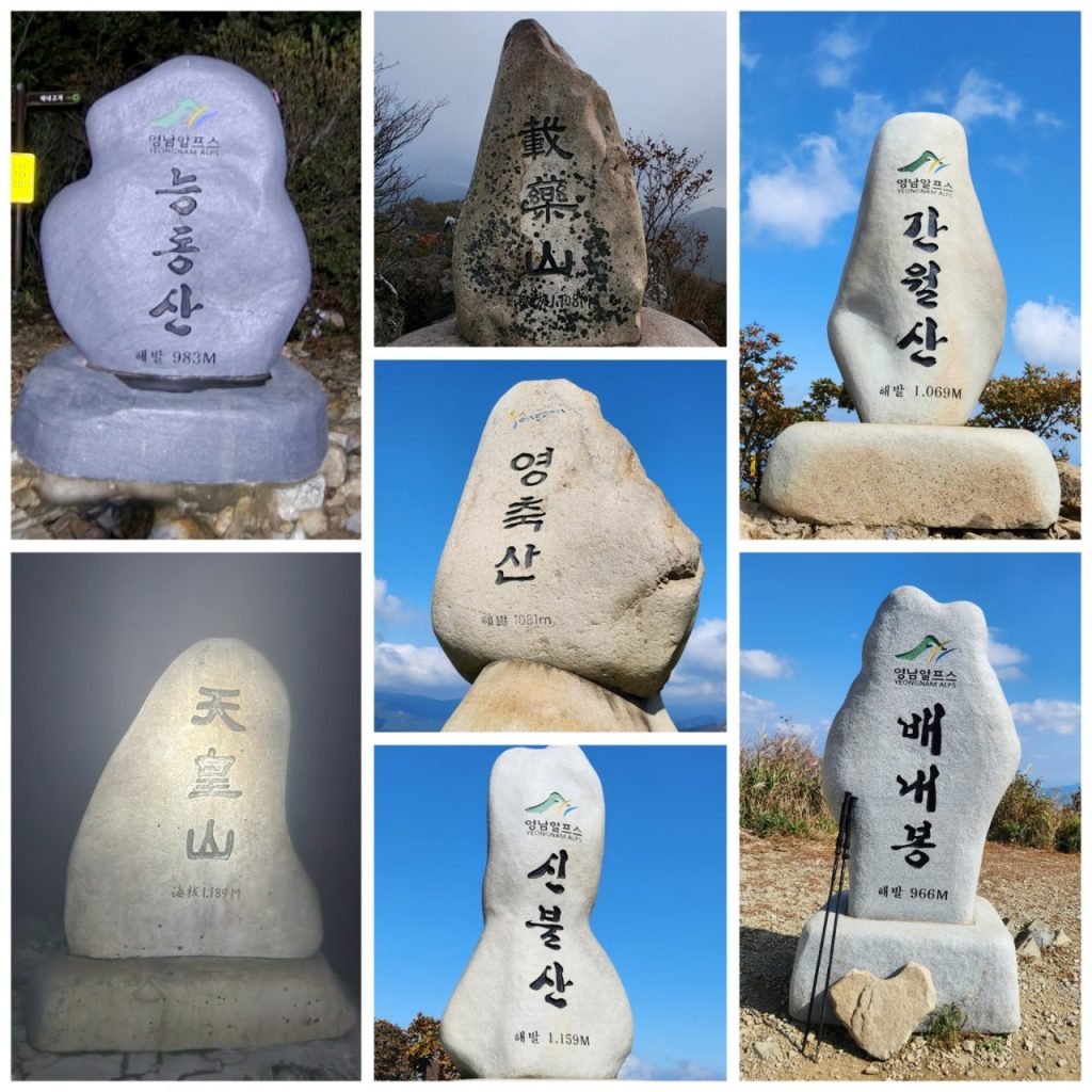 등산코스 : 4구간-단풍사색길(배내고개~능동산-샘물상회-천황산)➞3구간-사자평억새길(천황산-천황재-재약산-죽전마을)➞2구간-단조성터길(죽전마을~국립신불산폭포자연휴양림~영축산)➞1구간-억새바람길(영축산~신불재~신불산~간월재)➞5구간-달오름길(간월재~간월산~배내봉~배내고개)