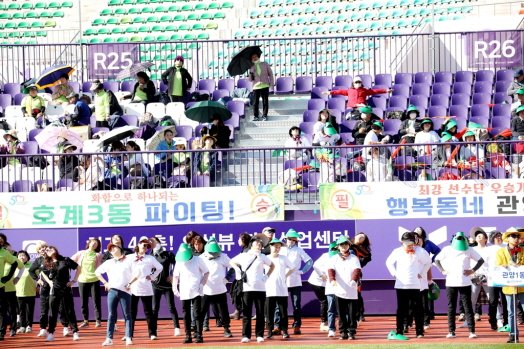 이날 체육대회에는 관내 31개 동의 시민 등 1만여명이 참석한 가운데 명랑릴레이, 축구, 여자승부차기, 바구니 공 넣기, 한궁, 슐런 등 6개 종목의 경기가 열렸다.