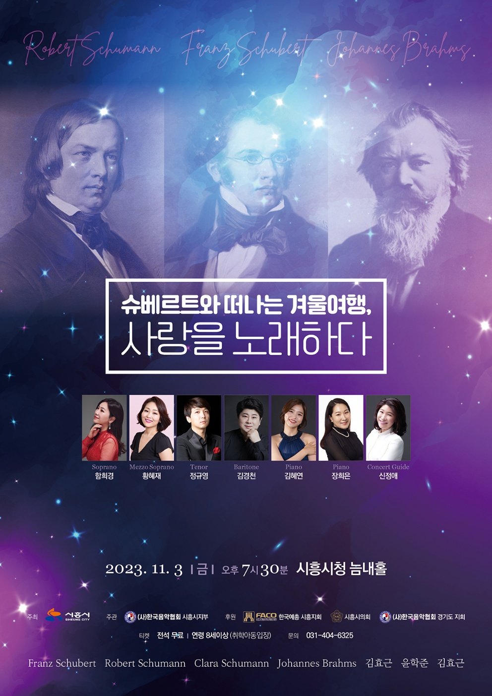 시흥시(시장 임병택)가 주최하고 한국음악협회 시흥지부가 주관하는 성악 공연 <사랑을 노래하다>가 오는 11월 3일 오후 7시 30분에 시흥시청 늠내홀에서 개최된다.