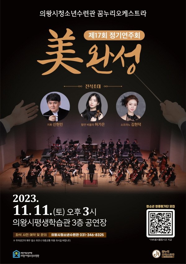 의왕시청소년재단은 오는 11일 의왕시평생학습관 3층 공연장에서 의왕시청소년수련관 꿈누리오케스트라의 제17회 정기연주회 ‘美완성’을 개최한다고 밝혔다.