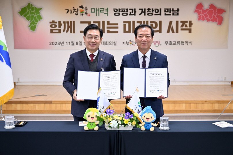 양평군은 경상남도 거창군과 지난 8일 군청 대회의실에서 양 도시 간 공동 발전과 번영을 위한 우호 결연 업무협약 체결식을 개최했다.