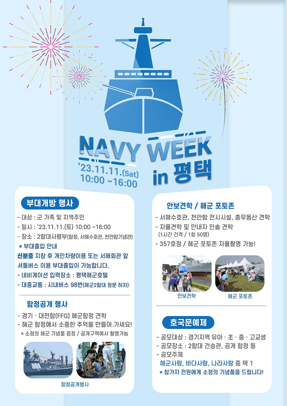 2함대 부대개방행사 참여를 희망하는 국민은 11일(토) 오전 10시부터 오후 16시 사이 신분증(초등학생 이하는 보호자 동행 필요)을 지참해 평택해군기지로 오면 된다.
