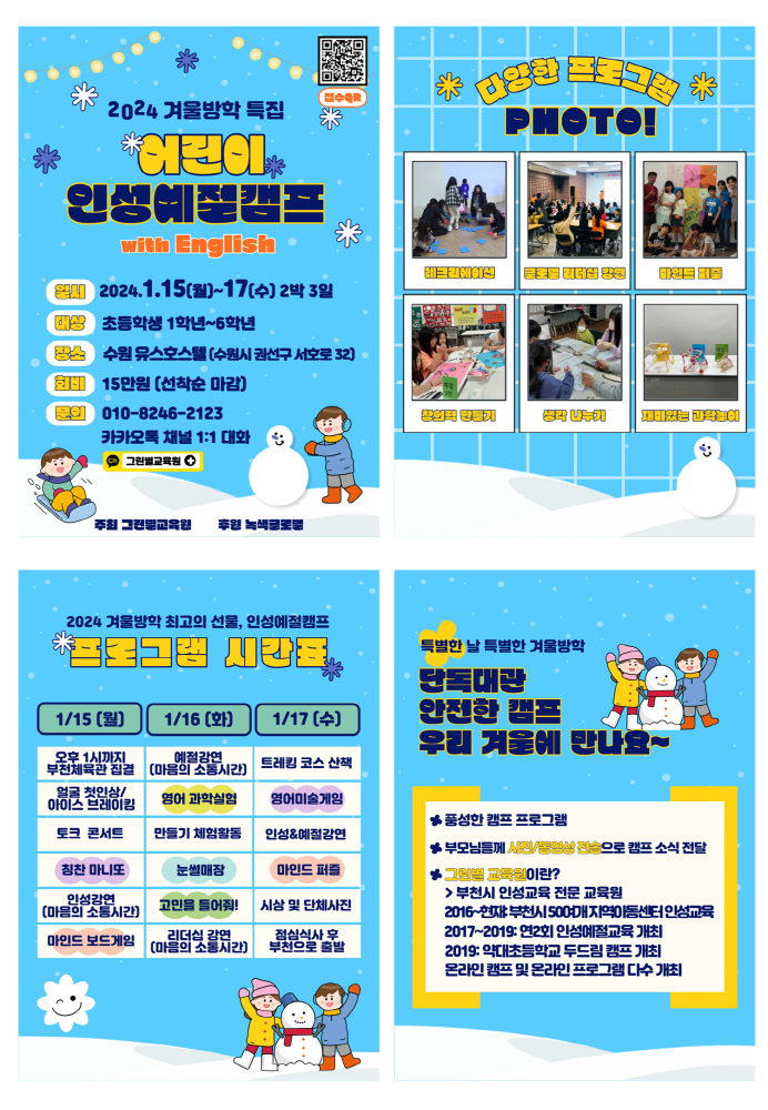 숨겨진 재능과 끼를 찾아주고, 도전하는 마음과 건전한 마음가짐을 배울 수 있는 즐거운 2024 겨울방학 어린이인성예절캠프에 초등학생 여러분을 초대합니다.