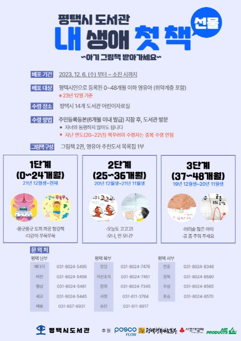 이번 ‘내 생애 첫 책’ 선물은 에어프로덕츠코리아㈜의 도서관 발전 기금, 포스코플로우의 도서 후원, 사랑의 열매와 평택시행복나눔본부의 협력으로 제공한다.