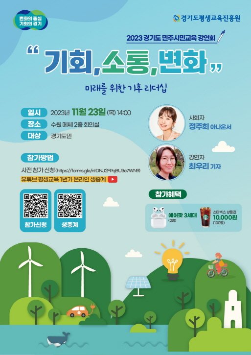 경기도평생교육진흥원은 23일 수원메쎄 2층 회의실에서 ‘2023년 경기도 민주시민교육 인식개선 강연회’를 개최한다.