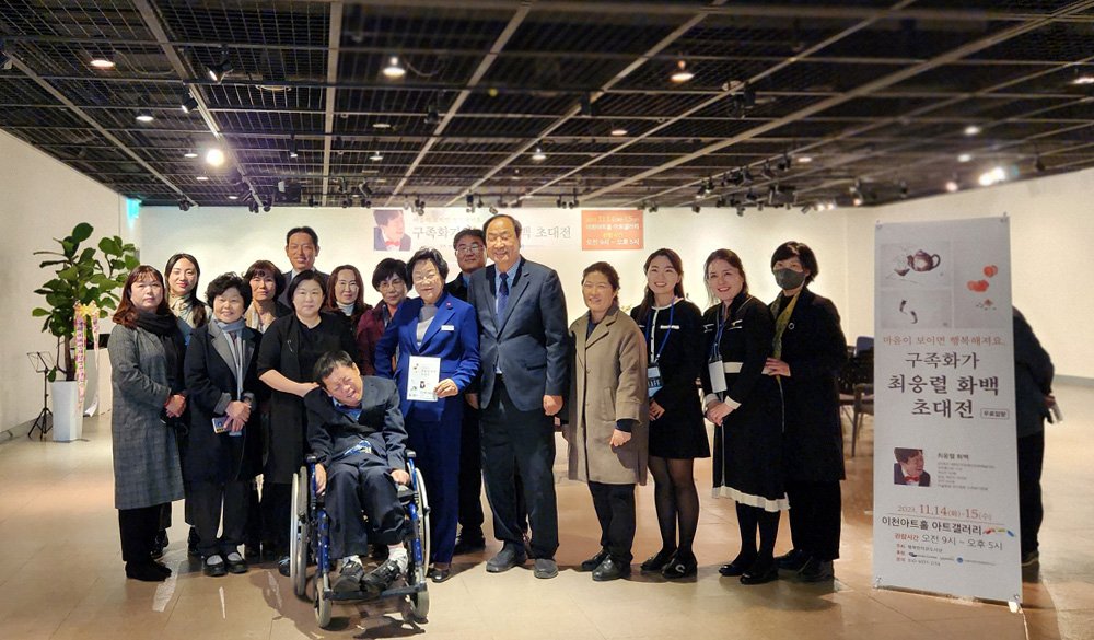‘구족화가 최웅렬 화백 초대전’을 찾은 시민들과 기념촬영. 이천아트홀 아트갤러리