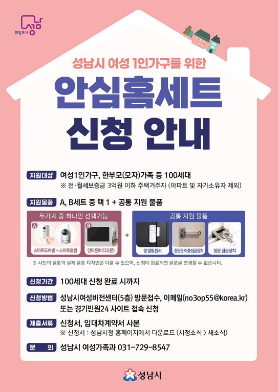 성남시는 여성 1인 가구 100명에 안심홈세트(4~5종)를 지원한다고 밝혔다.