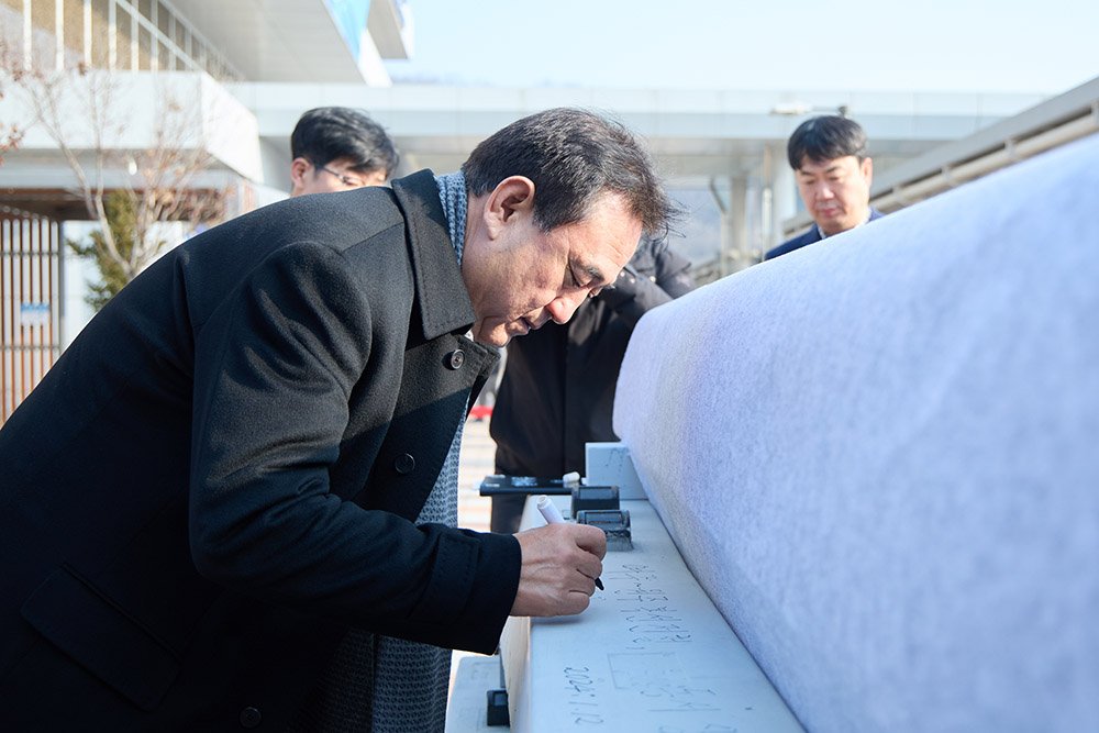 여주⟷원주 복선전철 건설사업 착공식에 강천역 신설이 꼭 필요하다는 내용을 작성하는 이충우 여주시장. 1월 12일