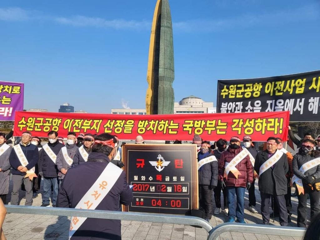 경기국제공항유치시민협의회가 30일 국방부 앞에서 수원 군 공항 이전사업을 촉구하는 집회를 하고 있다.