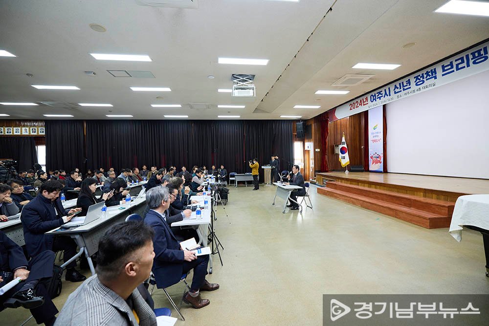[특별취재] “여주 발전” 이충우 여주시장, 110명 미디어 관계자와 정책 질의응답 진행. 2024 여주시 신년 정책 브리핑이외에도 신청사 건립과 역세권 개발과 기업유치, 남한강 제2여주대교 건설 여부, 사업 예산 정도, 가축분뇨 사업 관련, 산업단지 조성 시 상수원 오염 문제 등 질의와 답변이 있었다.