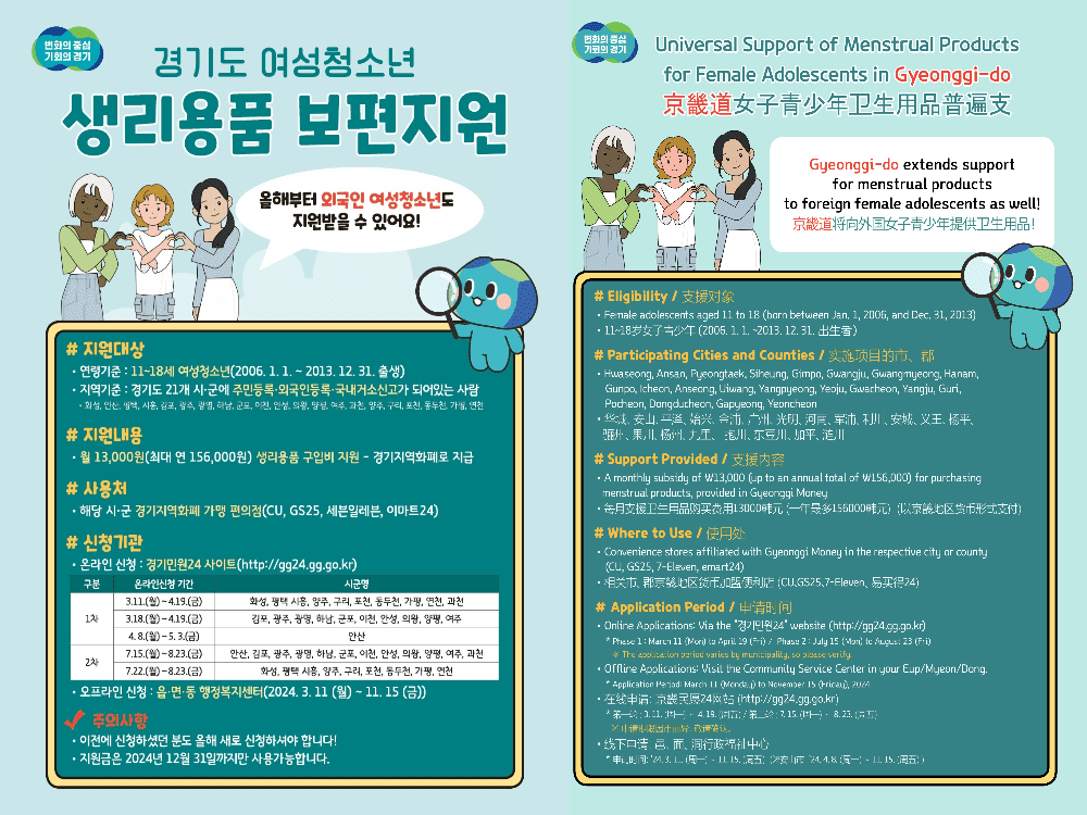 지난해 10월 ‘경기도 여성청소년 생리용품 지원에 관한 조례’ 개정에 따라 올해부터는 도내 등록외국인과 국내거소신고 외국국적동포 여성청소년에게도 생리용품 구입비를 지원한다.