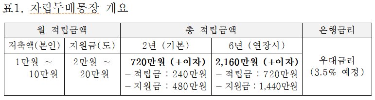 청소년이 1만 원을 저축하면 도가 2만 원을, 10만 원을 저축하면 20만 원을 추가 적립하는 방식인데 최초 2년씩 최대 6년까지 저축할 수 있다. 10만 원씩 최대 6년을 저축할 경우 본인 적립금 720만 원에 도 적립금 1,440만 원을 합친 2,160만 원에 이자를 추가로 받을 수 있다. (표1. 참조)
