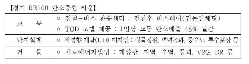 [경기도 돌봄의료 원스톱 센터 시설구성(안)]네 번째로, 경기북수원테크노밸리는 경기 RE100 비전(2030년까지 신재생에너지 발전비중을 30프로 달성하고, 온실가스는 40프로 감축하겠다)을 구현하는 RE100탄소중립 타운으로 조성한다.