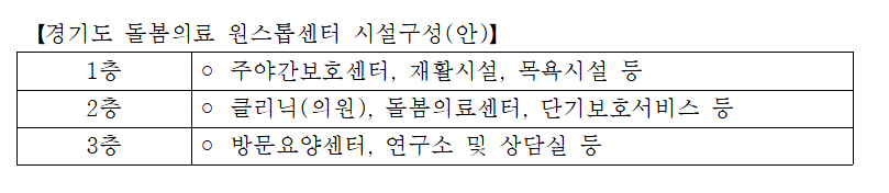 경기도 ‘돌봄의료 통합센터’ 내에는 방문의료, 재활치료, 단기입원, 주야간보호 등의 시설을 통합적으로 설치운영할 계획이다. 경기도는 단지 내 돌봄의료 통합센터가 설치되면 입주민 및 지역주민들의 요양병원 입원이 최소화되고 방문의료를 통해 건강한 삶을 누릴 수 있을 것으로 내다봤다.