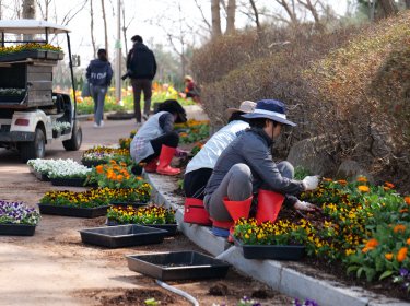 1-4. 용인특례시 관계자가 농촌테마파크 입구에 봄꽃을 심고 있다.