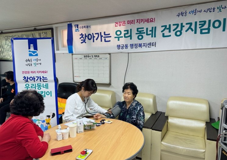 ‘찾아가는 우리 동네 건강지킴이’는 행궁동 행정복지센터에서 근무하는 간호직 공무원이 마을 간호사가 되어 어르신들이 자주 모이시는 곳에 방문해 혈압, 당뇨, 콜레스테롤 등 기초 건강 상태를 체크하는 사업이다.