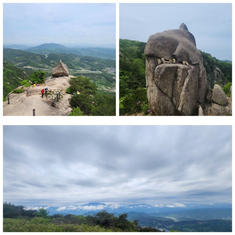 모산재의 공룡바위와 돗대바위를 보고, 유턴해 모산재에서 순결바위 방향으로 내려 갑니다. 내려오다보니 어떤 젊은 여성 등산객이 다리에 쥐가 나 당황하고 있습니다. 얼른 의자에 앉게하고 마그네슘제를 주고 스트레칭 하는 법을 알려주고 하산을 합니다. 종종 산을 다니다보면 그런 등산객을 가끔 만나는데 숲길등산지도사 자격증을 딸 때 배웠던 응급처치법이 참 유용하다는 생각이 듭니다.