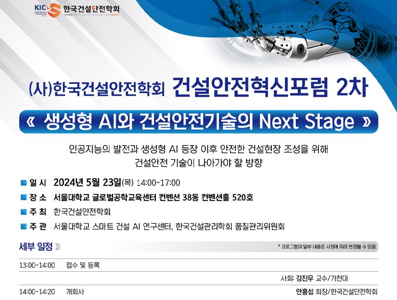 혁신포럼은 서울대학교 글로벌공학교육센터 컨벤션홀520호 장소에서 ‘생성형 AI와 건설안전기술의 NEXT Stage’라는 주제로 진행된다.