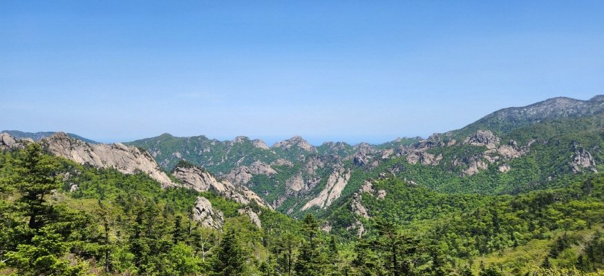 하여, 바위 사이에 넘어지는 찰라 무릎을 꿇히면서 등산가방을 돌에 기대면서 바위사이로 넘어졌다. 아뿔사! 나의 거북이 배는 하늘 방향으로 향해 있고 등은 땅에 있어 바둥바둥 하는 모습이 어찌나 민망하던지 웃음이 엄청 나오더라구요. 앞 사람이 잡아줘 간신히 일어났어요. 순간 일어난 사고라 아찔했네요. 잠시 마음을 가다듬고 대승령 방향으로 서북능선을 타면서 뒤를 보니 정말 풍경이 장관입니다.