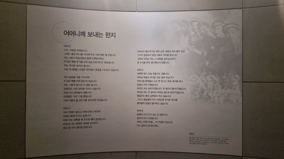 어머니! 나는 사람을 죽였습니다. 그것도 돌담 하나를 두고 10여 명은 될 것입니다. 저는 2명의 특공대원과 함께 수류탄이라는 무서운 폭발 무기를 던져 일순간에 죽이고 말았습니다. 저는 무서운 생각이 듭니다. (이우근 학도의용군이 어머니에게 보내는 편지 중 일부내용) 사진: 김정옥, 경기남부뉴스