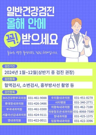 한편 의료급여수급권자 건강검진에 대한 자세한 사항은 의왕시보건소 정신건강팀(031-345-2933)으로 문의하면 된다.