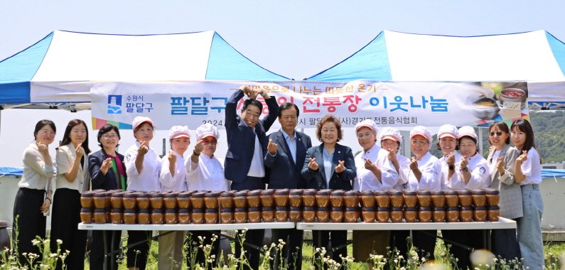 수원시 팔달구가 13일 팔달구청에서 ‘팔달구 사랑의 전통장(醬)이웃나눔’ 전달식을 개최했다. 이날 행사에는 사단법인경기도 전통음식협회가 참여해 직접 담근 된장 300개를 팔달구 사회복지과및 동 행정복지센터를 통해 관내 취약계층 가정에 전달했다.