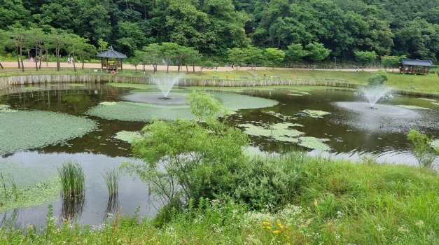 초막골생태공원안에는 아름다운 연못과 시원하게 품어나는 분수대가 찿아오는 이들의 발걸음을 사로잡는 곳이다. 사진: 경기남부뉴스