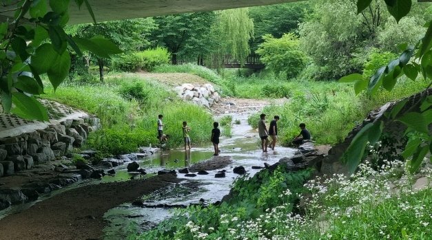 장마비가 잠시 멈춘사이 아이들이 하천에서 물놀이를 즐기고 있다. 이번 장마는 7월 중순까지 이어질 전망이다.