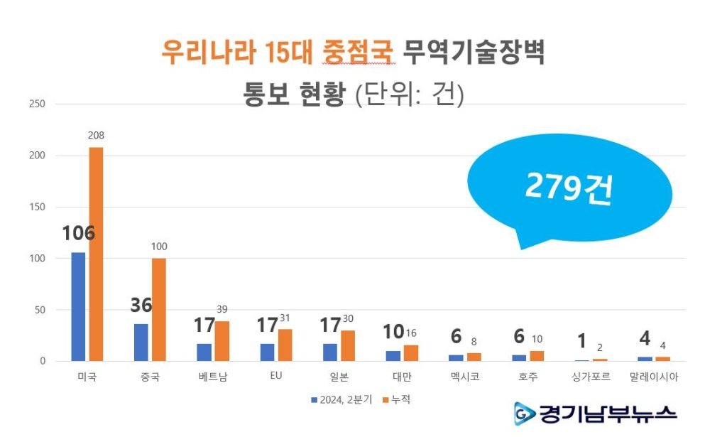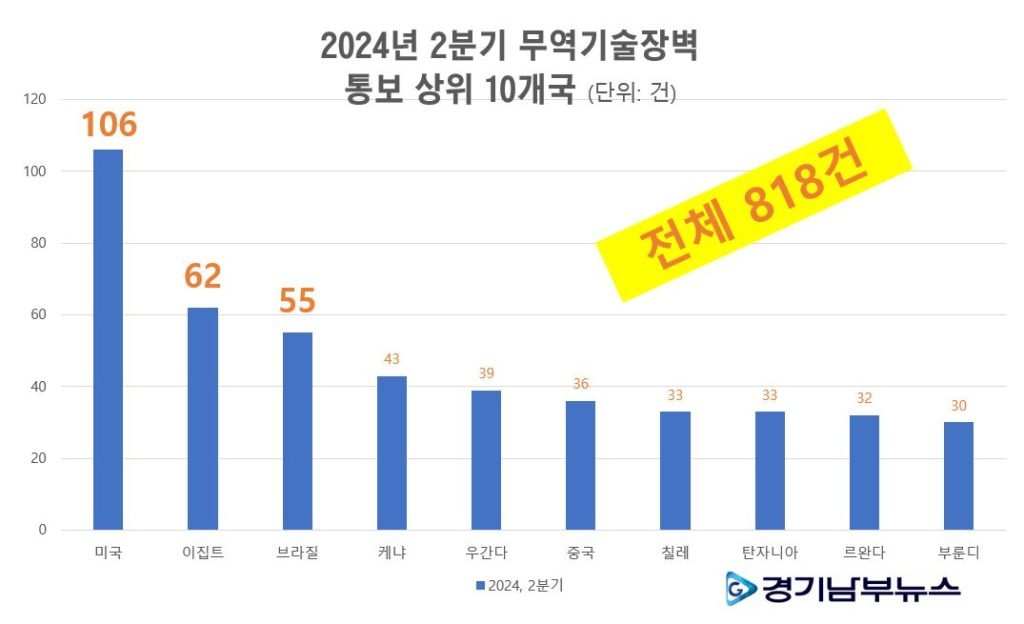 2024 2분기 WTO 회원국의 기술규제 통보건이 818건이다. 최상위는 미국(106건, 전체 13%) 이집트(62건) 브라질(55건) 등 이다.국가기술표준원은 17일 WTO(세계무역기구) 회원국이 통보한 기술규제를 발표했다. 올 상반기 수출 호조세를 기록하여 정보통신(IT) 기기 등 전기전자 분야와 자동차, 선박 등 교통안전 분야의 기술규제가 미국, 칠레, 중국 등 주요 교역국을 중심으로 통보됐다.