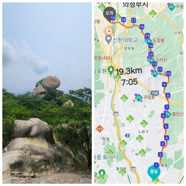 *등산코스 : 화랑대역4번출구-공릉산백세문-노원고개⁃불암산성⁃불암산깔딱고개 ⁃불암사제3야영장샘 거북바위-불암산-불암산다람쥐공원-석장봉(백바위)-덕릉고개-도솔봉(540봉)-안부삼거리- 치마바위-코끼리바위-칠모바위⁃수락산-도정봉-동막봉⁃장암주공삼거리-회룡역