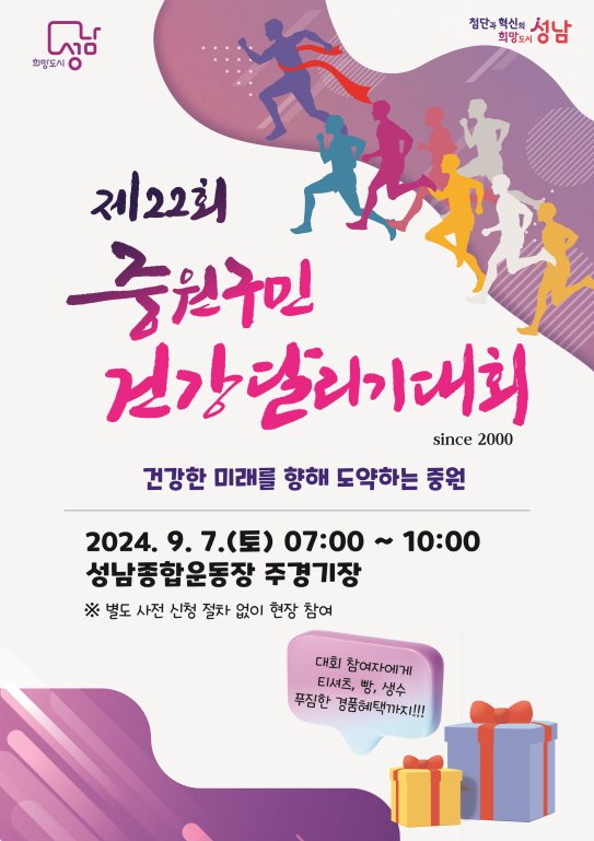 성남시 중원구는 오는 9월 7일 오전 7시~10시 ‘제22회 중원구민 건강달리기 대회’를 개최한다고 밝혔다.