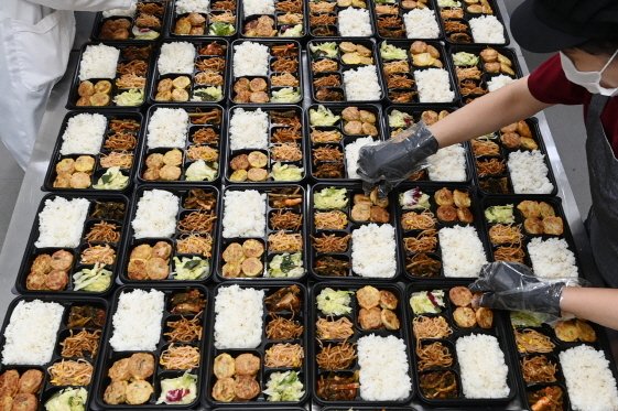 제공기관에서 수원새빛돌봄 식사배달 서비스를 위한 도시락을 만들고 있는 모습.