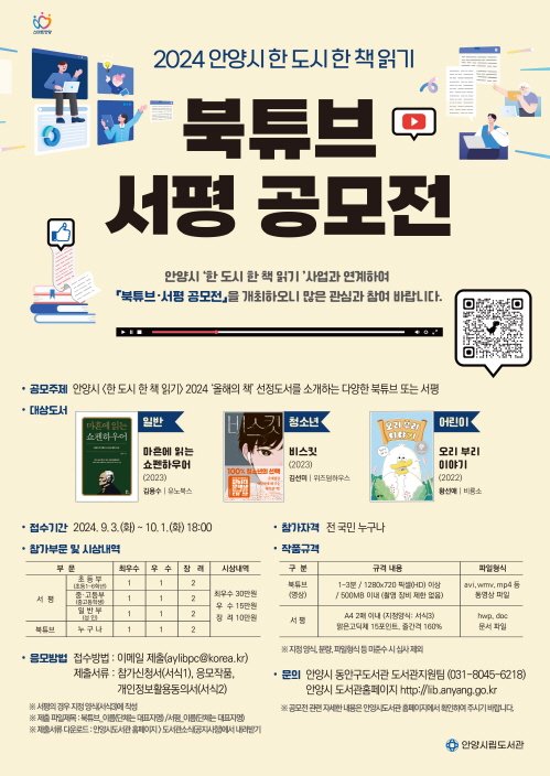 북튜브·서평 공모전에 관한 자세한 안내 사항은 안양시 도서관 누리집(https://lib.anyang.go.kr)에서 확인할 수 있다.
