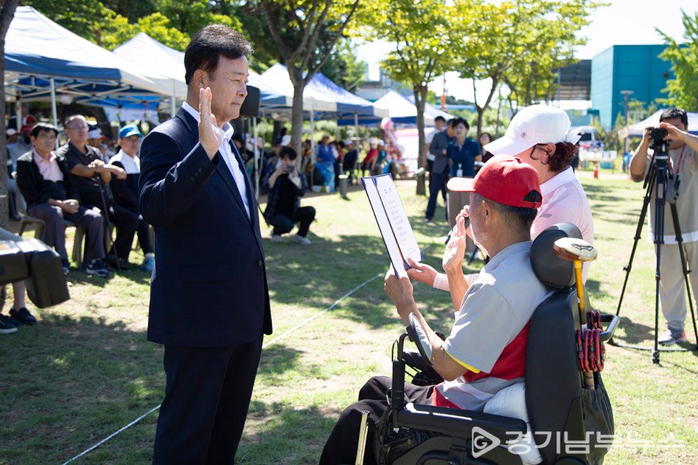 의왕시장애인체육회장인 김성제 의왕시장과 선수대표의 선서식, 2024 의왕시장배 장애인 어울림 파크골프 대회