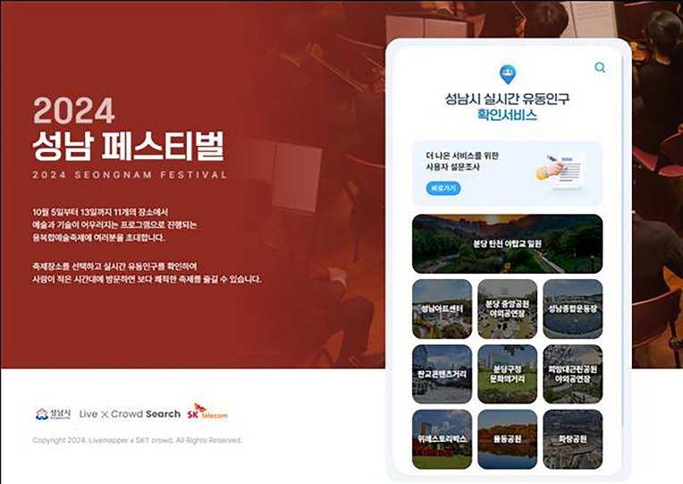 성남시(시장 신상진)는 오는 10월 13일까지 성남페스티벌 기간에 맞춰 ‘실시간 유동 인구 확인 서비스’를 한시적으로 운영한다고 7일 밝혔다.
