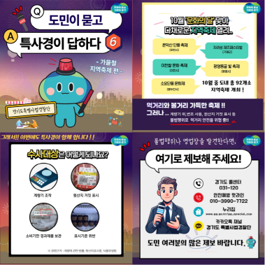 경기도 특별사법경찰단이 10월 14일부터 11월 8일까지 화성시 루나빛축제 등 36개 가을축제장을 찾아 축제장 주변 먹거리 사전 점검에 나선다.