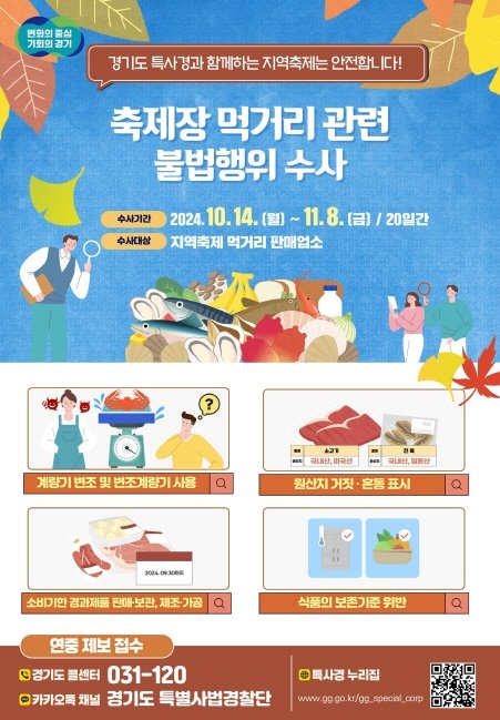 기이도 경기도 특별사법경찰단장은 “가을철 지역축제에서 인기가 많은 식품 등에 대한 점검을 실시해 방문객에게 안전한 먹거리가 공급될 수 있도록 하겠다”면서 “식품안전에 위협이 될 수 있는 불법행위에 대해서는 관련 법령에 따라 강력하게 처벌할 방침”이라고 말했다.