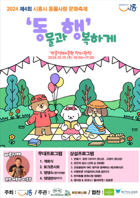 시흥시(시장 임병택)는 오는 19일 오전 10시부터 오후 5시까지 시흥시 갯골생태공원(장곡동 동서로287) 잔디광장에서 동물사랑 문화축제 ‘동물과 행복하게’ 행사를 개최한다.