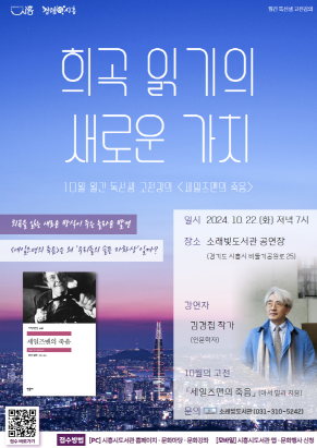 시흥시 소래빛도서관은 10월 22일 오후 7시에 도서관 공연장에서 ‘월간 독선생 고전강의–희곡 읽기의 새로운 가치’를 운영한다.