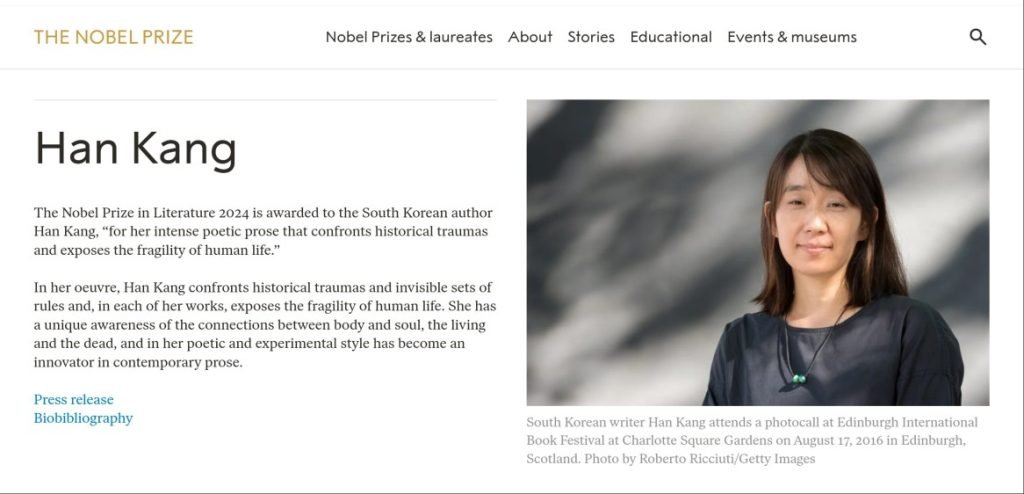 소설가 한강이 한국인 최초이자 아시아 여성 최초로 노벨문학상을 받았다. 한국 문학의 새역사를 쓴 것이다. 10월 10일 수상자 발표가 나자 수많은 언론은 감격스러운 마음을 담아 대한민국 경사인 작가 한강의 노벨문학상 수상 소식을 알렸다.