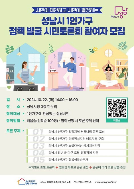 성남시 관계자는 “시민이 제안하고 시민이 결정하는 구조를 통해 피부에 와닿는 1인가구 지원 정책을 추진하게 될 것”이라고 말했다.