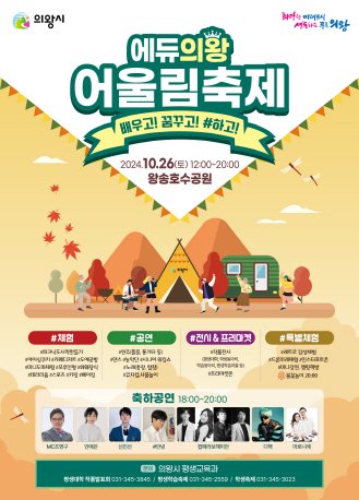 의왕시는 10월 26일 토요일 오후 12시부터 왕송호수공원에서 ‘2024 에듀의왕, 어울림축제’를 개최한다.