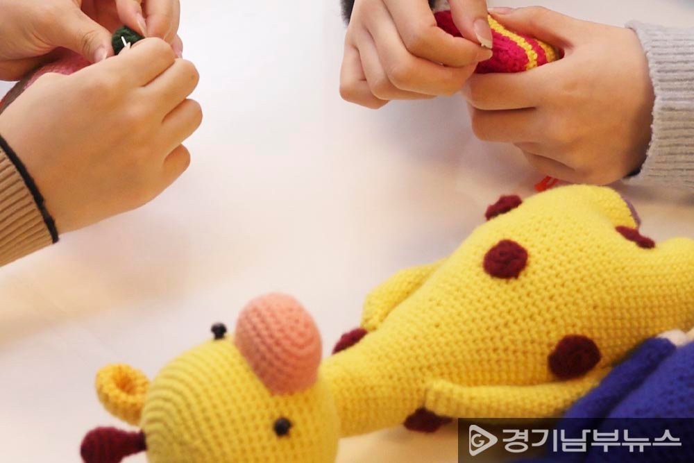 김천학교 간호학과 동아리 ‘RCY 예쁜 손 예쁜 맘’ 멤버들이 인형을 만들고 있다.