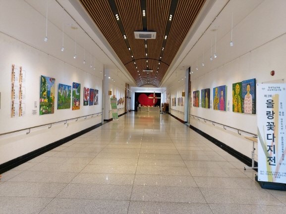 또한 로비 입구에서는 ‘의왕한글한마당 성과 공유 마당전’이 열리고 있다. 올해로 11회를 맞이한 ‘의왕한글한마당’은 갈미한글축제위원회와 의왕시 작은도서관협의회가 공동 주관해 지난 10월 9일 한글날 갈미한글공원에서 개최한 의왕시 대표 한글 행사다. 성과공유 전시에서는 행사 운영 사진과 부스별 체험 결과물, 캘리그래피 퍼포먼스 작품을 통해 축제의 생생한 현장 분위기를 느낄 수 있다.