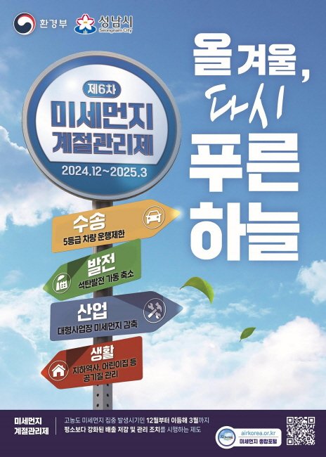 성남시는 오는 12월 1일부터 내년 3월 말일까지 ‘제6차 미세먼지 계절관리제’를 시행한다.