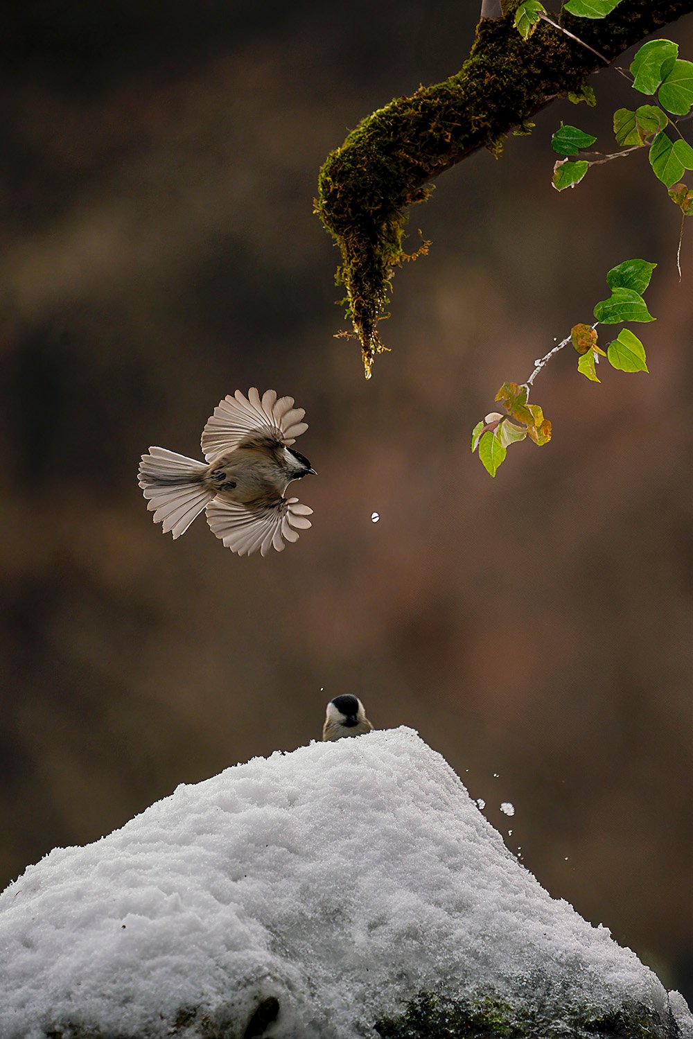 날개쭉지를 활짝 펴고 떨어지는 물방울에 돌진하는 박새 한 마리와 눈더미에서 모이를 찾아 앉아있는 박새가 묘한 대조를 이룬다.